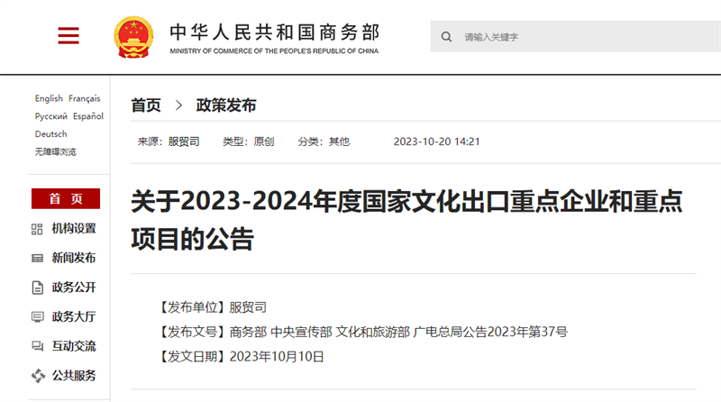 近日,商务部公布了2023至2024年度国家文化出口重点企业和重点项目名单。