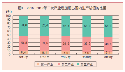 所占比重是一个总体中各个部分的数量占总体数量的百分比,主要用于反映总体的构成。计算方式是:部分的数量除以总体数量并乘以 100%。例如,国内生产总值由一、二、三产业构成,2019 年我国第三产业增加值为 535371 亿元,国内生产总值为 986515 亿元,第三产业增加值占国内生产总值的比重就是535371/986515×100%=54.3%。在进行经济分析时,我们经常会对比各个部分所占比重的变化,来反映结构的变化。例如,第三产业增加值所占比重由 2015 年的 50.8% 上升至 2019 年的 54.3%,4 年间上升了 3.5 个百分点;第二产业、第一产业的比重逐年下降。这三部分所占比重的变化显示我国经济发展步入新阶段, 经济结构战略性调整和转型升级加快推进,三次产业发展协调性显著增强。