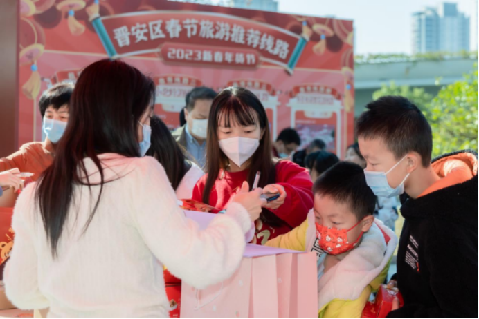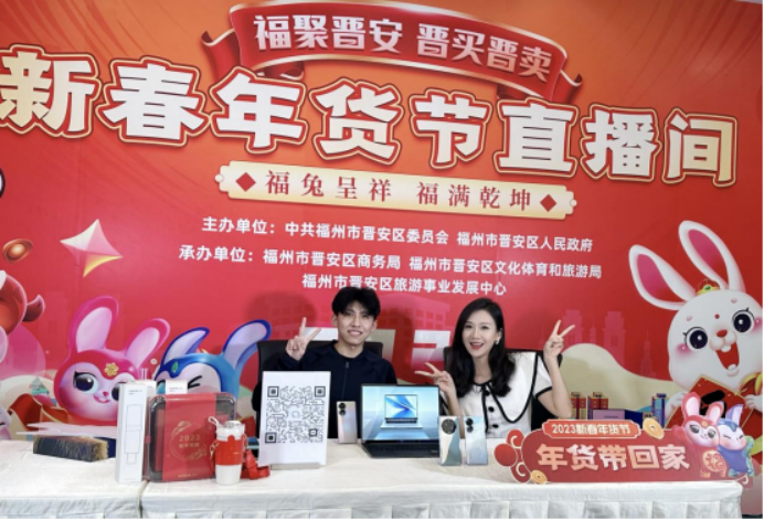 春节假日前,晋安区拉开新年促消费大幕,举办“福兔呈祥 福满乾坤”2023新春年货节活动,通过线下促销、线上直播、非遗展演等形式,组织各大商圈、商超开展打折促销活动。网络直播活动在福州广播电视台《攀讲V直播》火爆开启,为市民群众送出新春大礼。