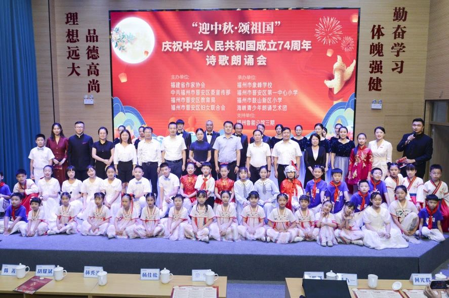 9月27日晚,由福建省作家协会、中共福州市晋安区委宣传部、晋安区教育局、晋安区妇联联合主办的“迎中秋·颂祖国”庆祝中华人民共和国成立74周年诗歌朗诵会在福州市象峰学校报告厅拉开帷幕,师生怀着热忱与激动的心情,以气势昂扬的歌声、精彩绝伦的表演、发自肺腑的朗诵献上对祖国母亲的祝福,分享欢度中秋佳节的喜悦。本场诗歌朗诵会分为“致先辈——致经典——致祖国”三个部分展开。