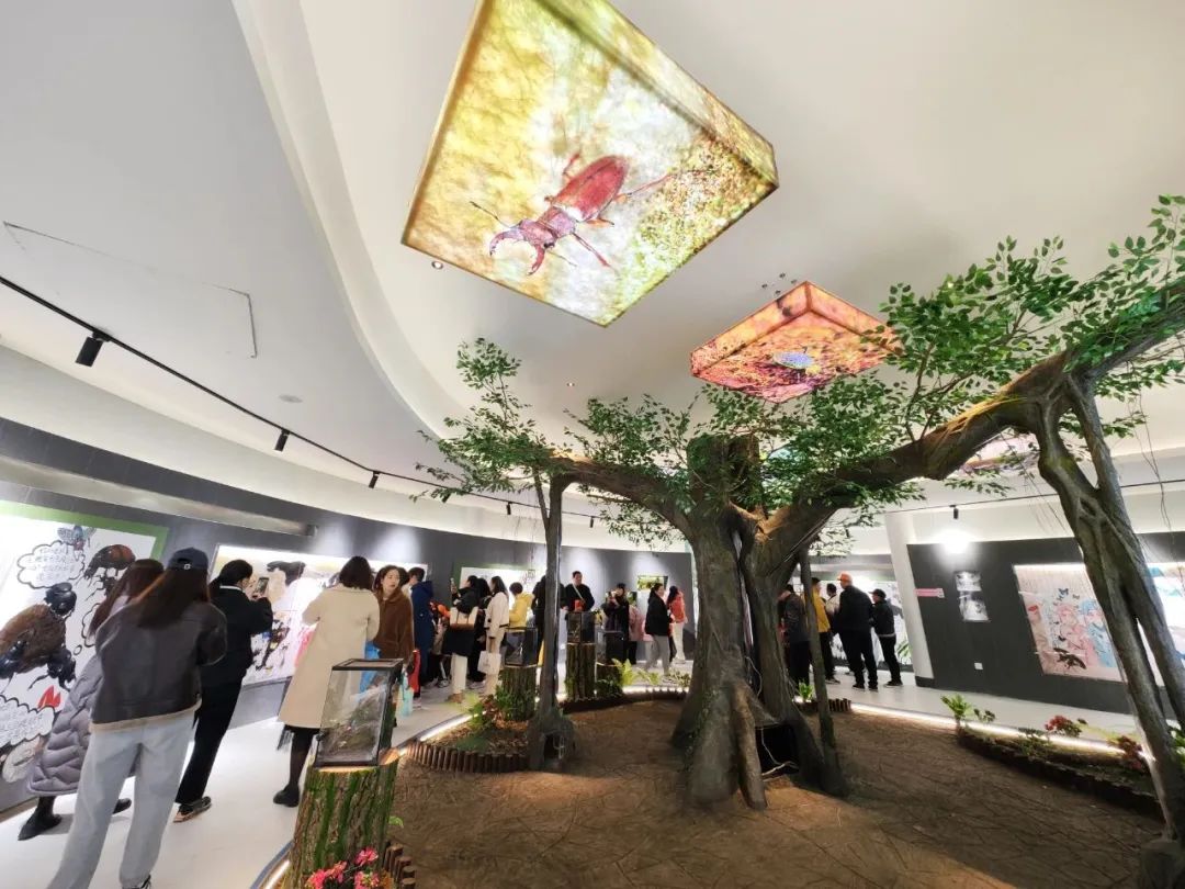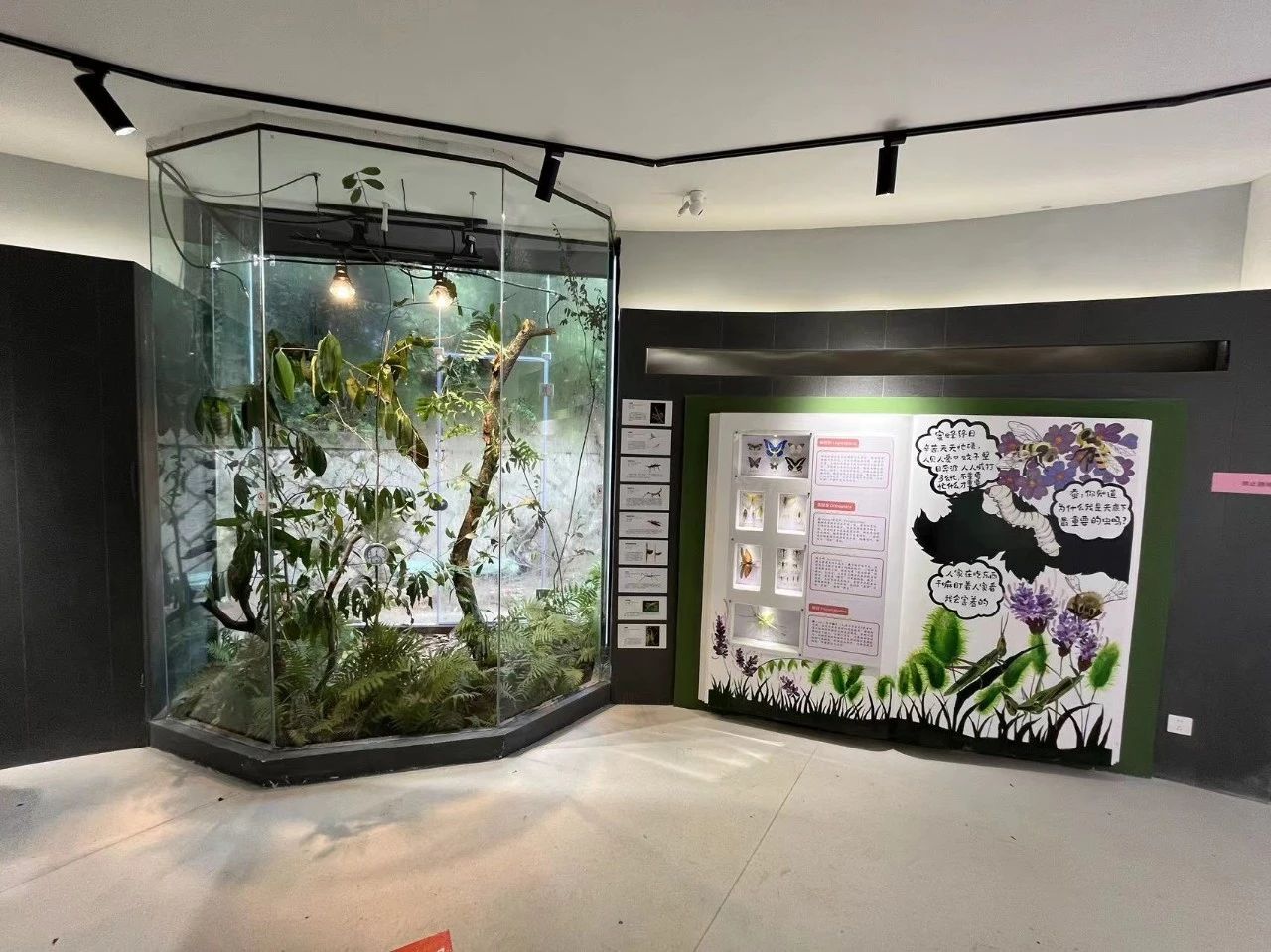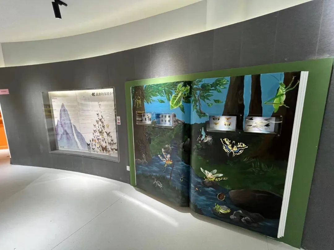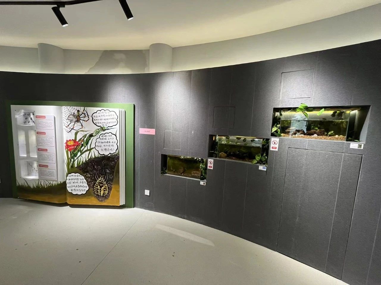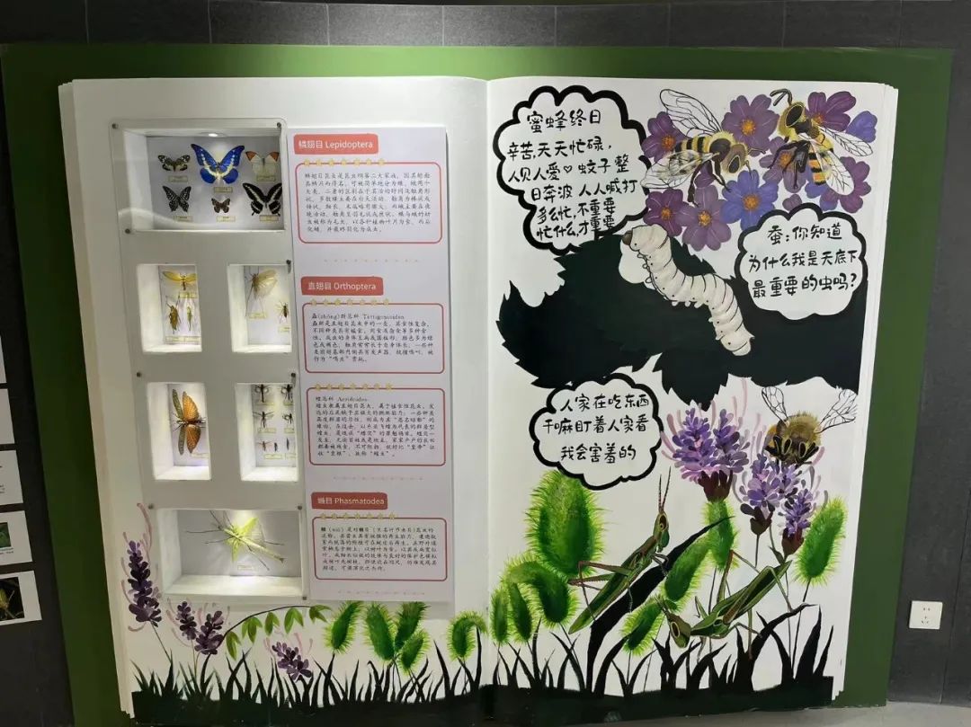 场馆分设两大区,自然科普区为生态造景风格,人文科普区为现代简约风格。展区又以5本展开的书为立意,分为5个区,主要以“标本+活虫+科普知识”的形式进行展示。