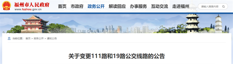 近日,福州市道路运输事业发展中心发布最新公告称,为方便群众出行,6月26日(本周三)起,111路和19路公交线路变更起讫站点。