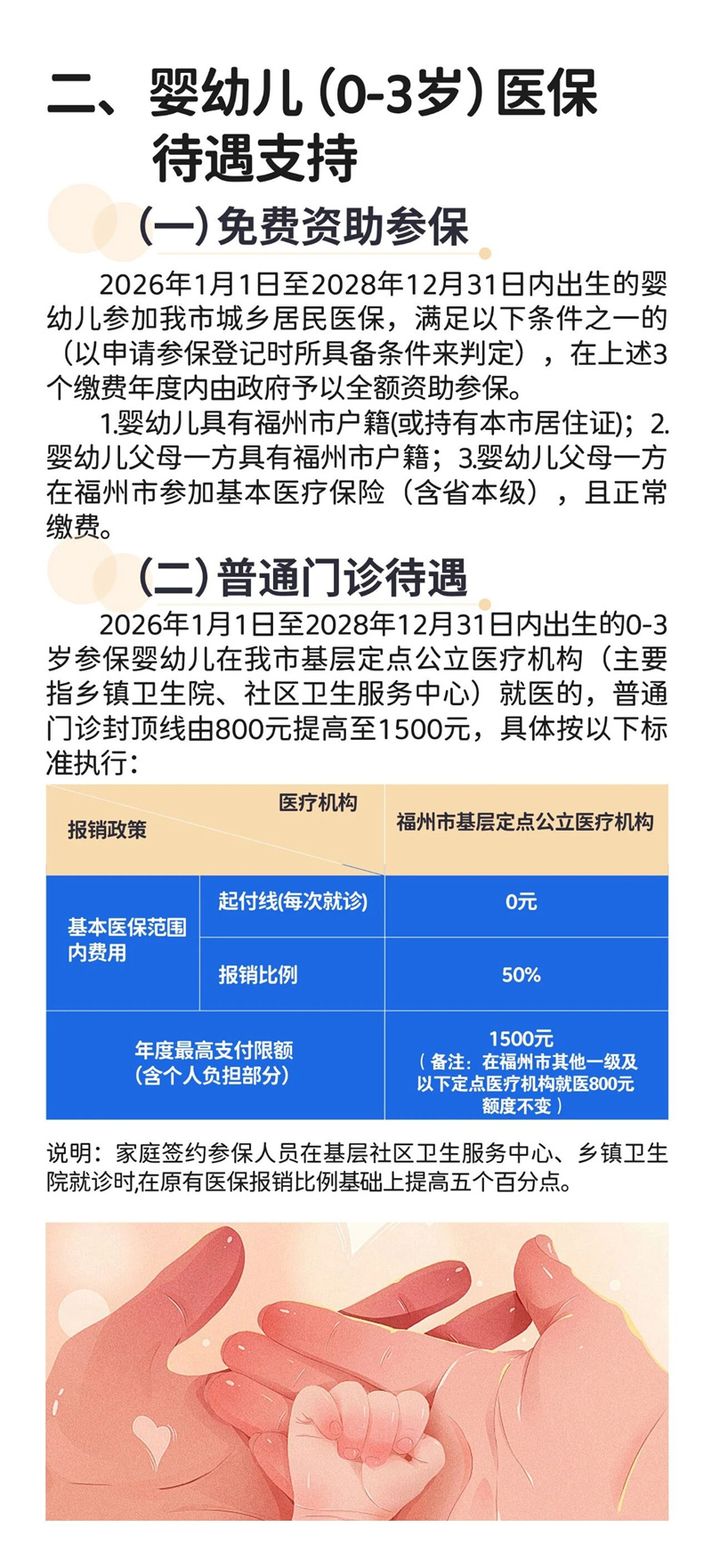 2026年1月1日至2028年12月31日内出生的0-3岁参保婴幼儿在我市基层定点公立医疗机构(主要指公立乡镇卫生院、社区卫生服务中心)就医的,普通门诊封顶线由800元提高至1500元,具体按以下标准执行: