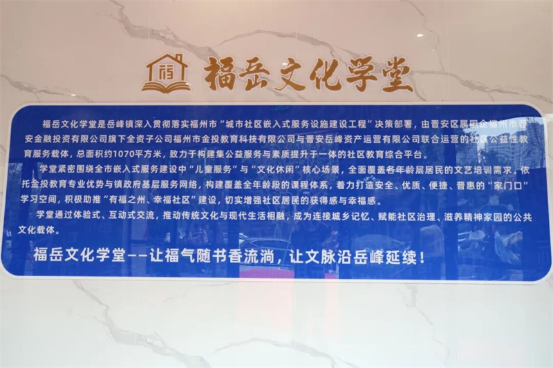 3月31日上午,由晋安区岳峰镇人民政府指导,福州市晋安区岳峰资产运营有限公司与福州市金投教育科技有限公司联合打造的福岳文化学堂正式揭牌启用。