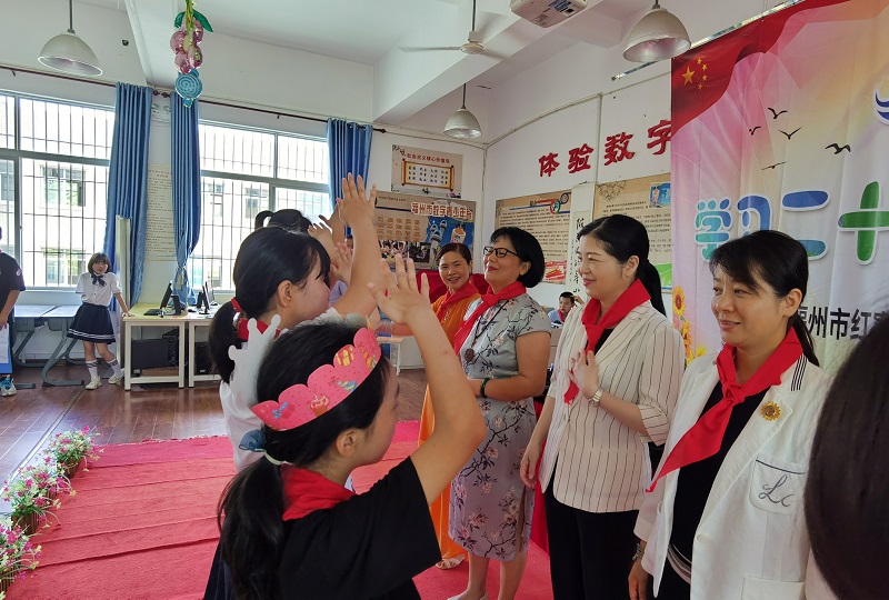 学生代表为区妇联领导和巾帼爱心人士佩戴上鲜艳的红领巾,并用标准的少先队礼向她们致以崇高的敬意。