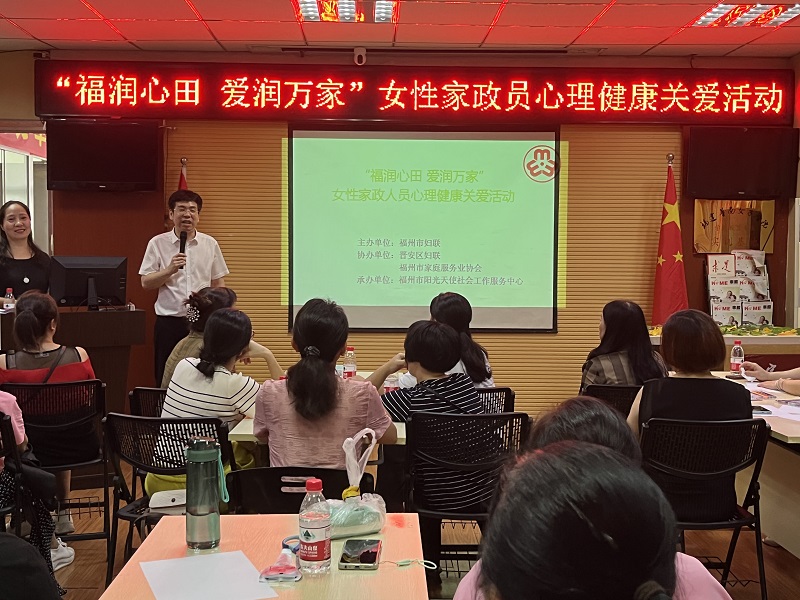 为关爱女性家政人员、“顶梁柱母亲”的心理健康,推动社区家政服务和妇女工作互融互促,8月9日福州市妇联联合晋安区妇联、福州市家庭服务业协会共同开展“福润心田 爱润万家”女性家政员心理健康关爱活动,更好地服务大局、服务妇女、服务家庭。活动邀请了国家二级心理咨询师、福州市阳光天使社会工作服务中心副理事长林羽为到场的家政服务人员和“顶梁柱母亲”授课,帮助大家放松心灵、释放负面情绪。