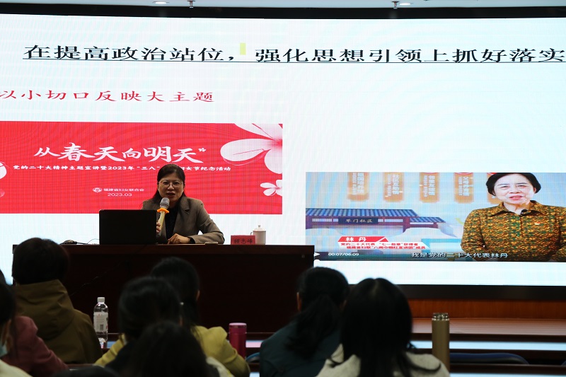活动特邀福建省妇女干部学校副校长、高级讲师顾志峰围绕“凝聚巾帼之力 汇集巾帼之智 在新的赶考路上推动妇联事业高质量发展”作专题讲座。顾老师从“习近平总书记关于妇女儿童和妇联工作的系列讲话精神”“全国妇女十三大会议精神”“习近平总书记关于促进男女平等和妇女发展的重要论述”等方面展开阐述和分析,讲解紧贴妇联干部工作实际,增强了妇联干部做好新时代妇女工作的信心和决心。