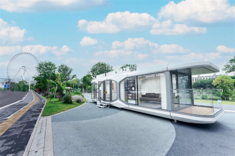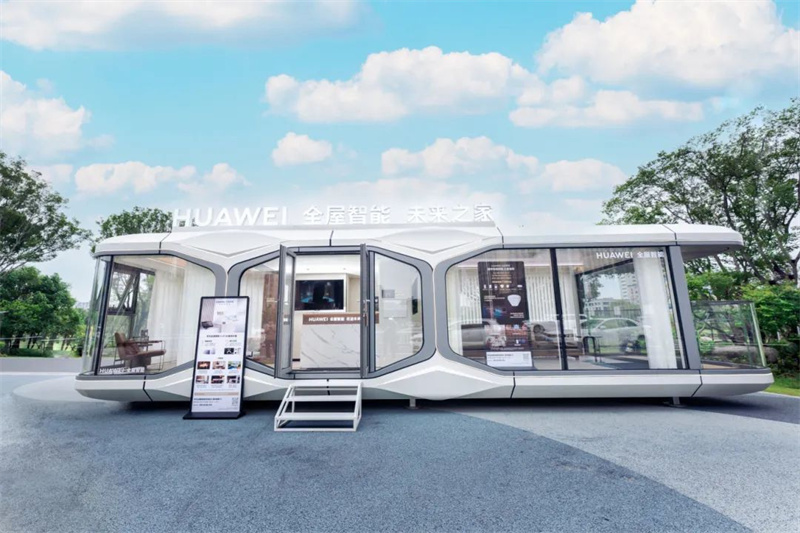 其中,华为全屋智能 未来之家融合空间、艺术、科技于一身,包括可移动的舱体与舱内全屋智能的展示设备,实现在多种场景下展示及体验全屋智能。未来之家通过回字形动线,共设置会客区、休憩区、接待展示区三个区域,全玻璃舱体视野通透,菱形边框尽显科技感。此外,车家联动、灯光秀、观影模式、会客模式等丰富场景的设置,带来舒适、健康、便捷的体验。