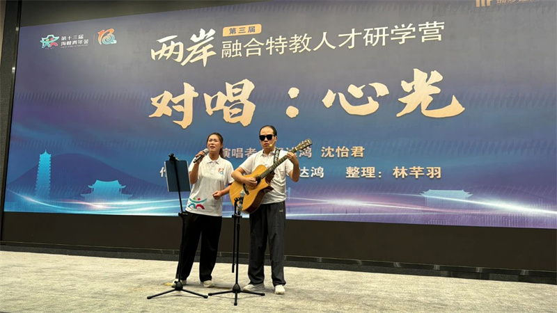 开营仪式上,一曲由大陆视障青年郑达鸿与台湾青年代表共同演绎的研学营主题曲《心光》闪亮登场。词作者为孤独症家长汪曙煌,曲作者为视障青年郑达鸿,传递了关怀特殊群体、期盼相互融合的积极主题,优美的旋律打动了在场所有人的心。