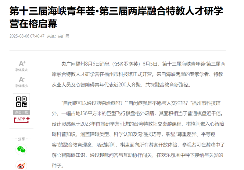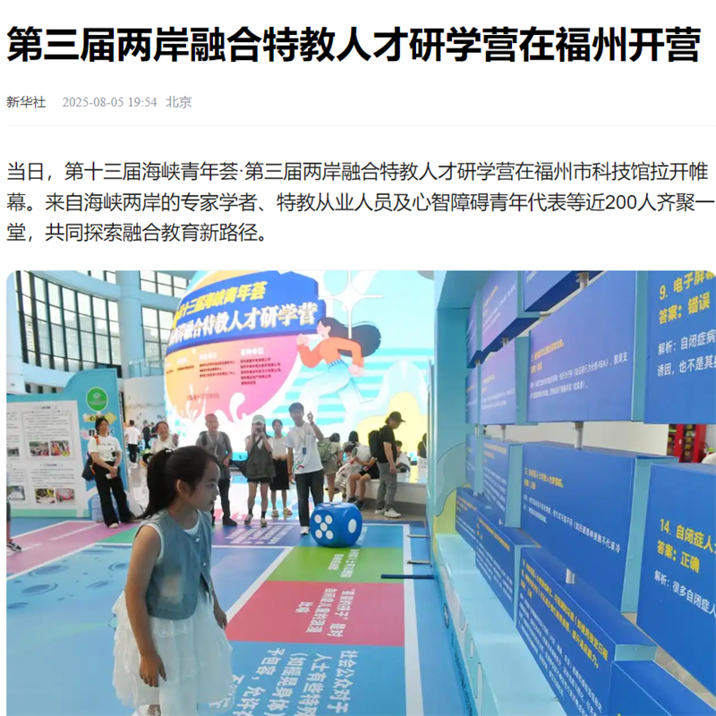 8月5日,第十三届海峡青年荟·第三届两岸融合特教人才研学营在晋安区拉开帷幕。来自海峡两岸的专家学者、特教从业人员及心智障碍青年代表等近200人齐聚一堂,共同探索榕台融合教育新路径。这是海峡青年荟·两岸融合特教人才研学营连续第三年在晋安区举办。