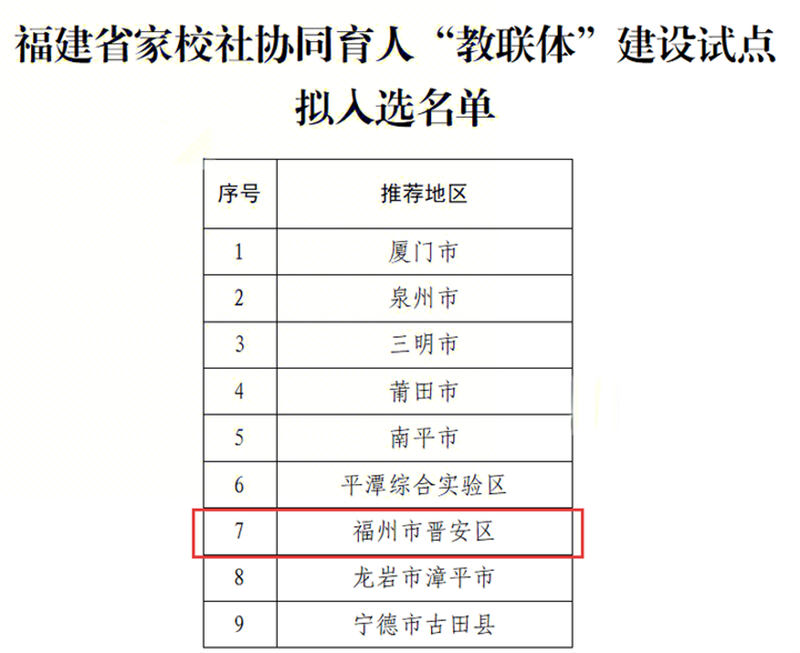晋安区系1996年区划调整时由郊区更名而来。由“郊”到“城”蝶变,教育事业是“刚需”也是“必需”。区委、区政府从“关注教育就是关注民生”和区域发展的高度提出了“要把教育做到家,把服务送到家”。从1.0版的“百校千师访万家”,到2.0版的家庭教育“个十百千万”工程,再到3.0版的“校家社协同育人”实验区创建,晋安一步一个脚印,经过多年持续不断地探索、实践和创新,形成了覆盖全区域,贯穿全学段的“2135”协同育人模式——