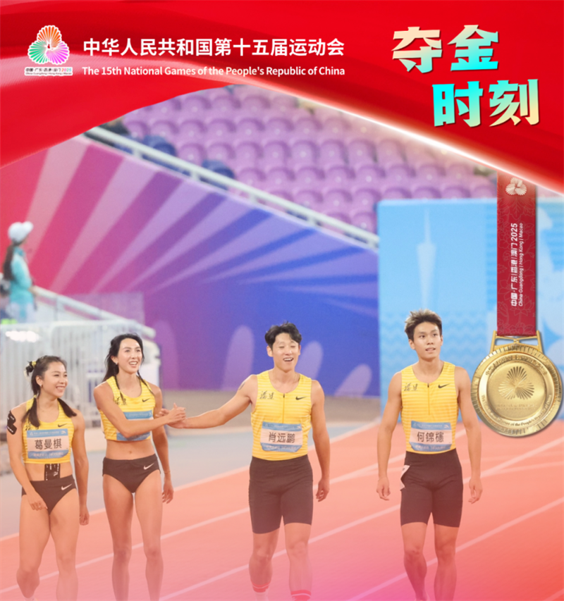 在田径4×100米混合接力比赛中,肖远鹏与队友携手夺得冠军并打破全国纪录。