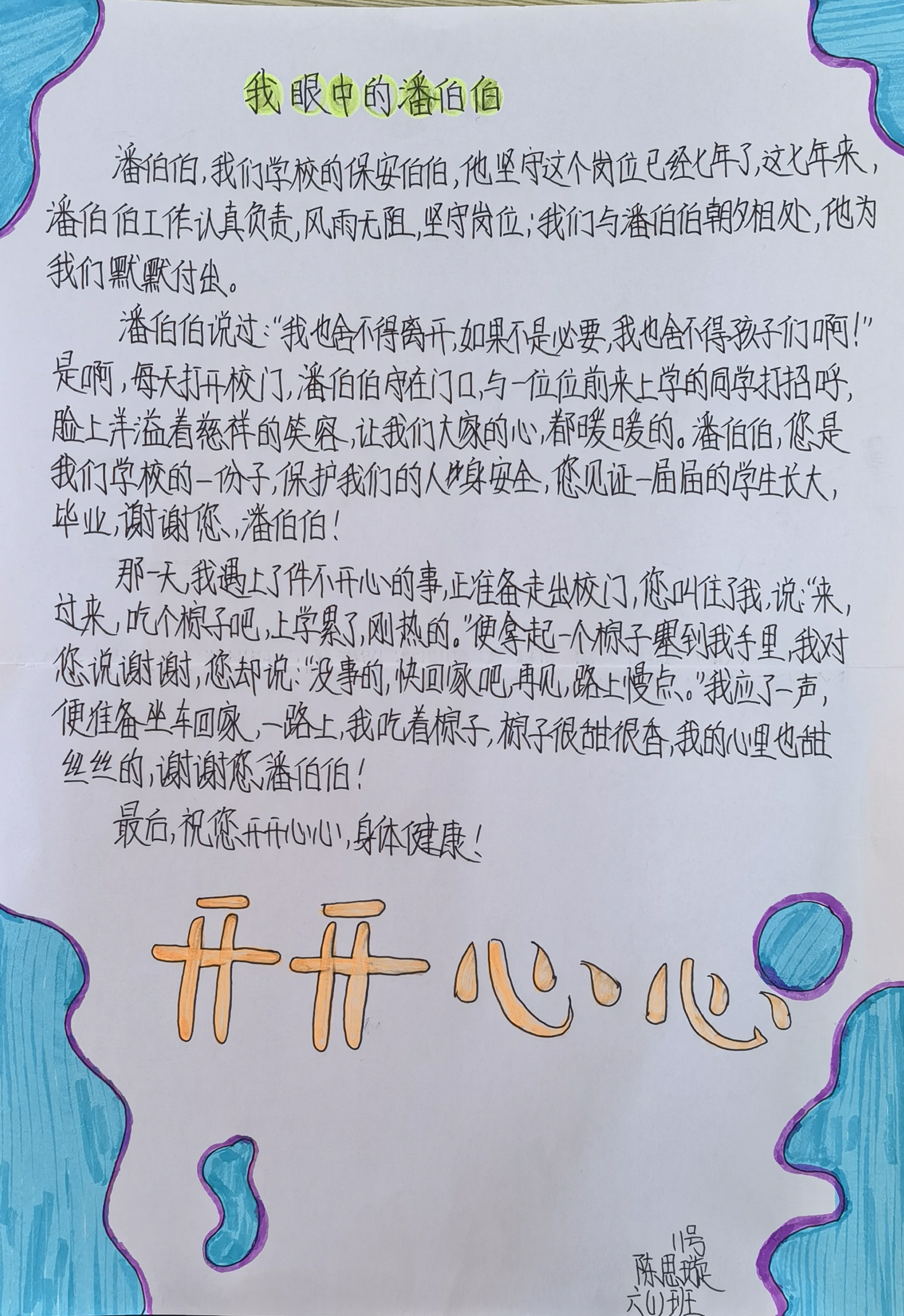 七年来,潘师傅在风雨中巡逻,烈日下站岗,热情周到,兢兢业业,深受广大师生的喜爱。在退休欢送晨会上,孩子们为他献上鲜花和感谢信,并齐声道别:“您辛苦了,常回家看看!”