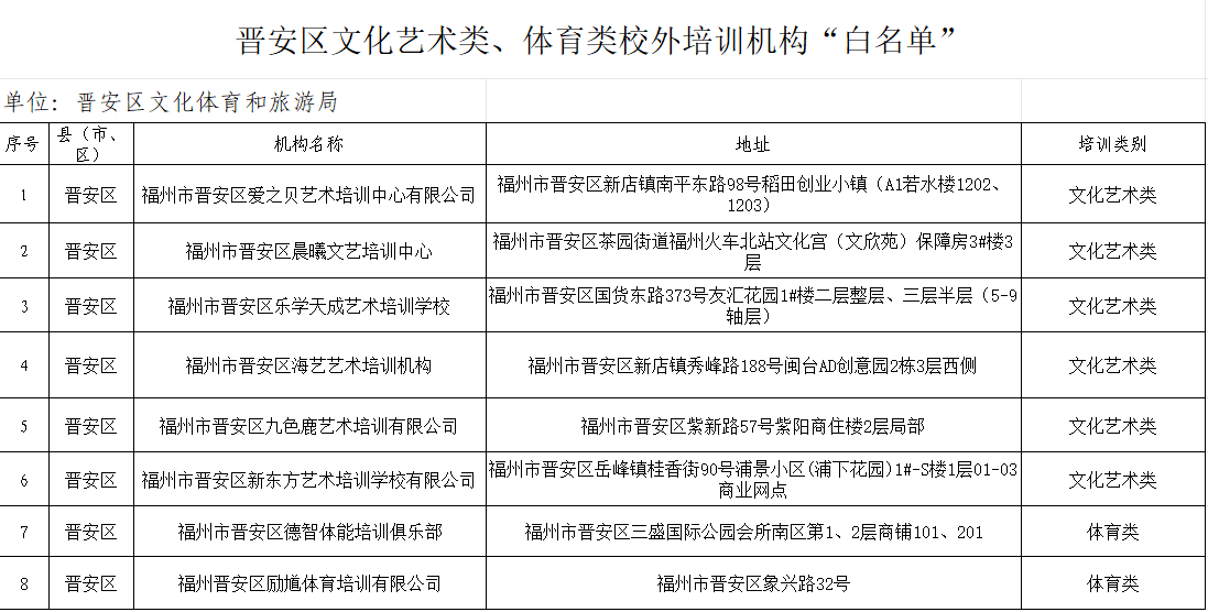 为进一步规范我区文化艺术类校外培训市场秩序,保障学生和家长的合法权益,经审核,现新增“福州市晋安区新东方艺术培训学校有限公司”纳入文化艺术类校外培训机构白名单。目前,我区共有文化艺术类、体育类白名单机构8家。具体如下: