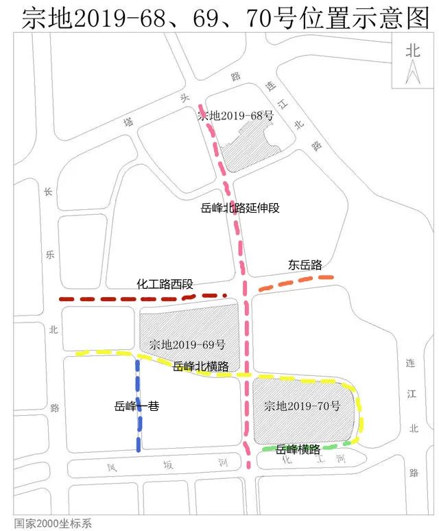 分别为化工路西段、东岳路、岳峰北横路、岳峰横路、岳峰北路延伸段及岳峰一巷,总体呈“三纵四横”路网格局,均为新建道路。