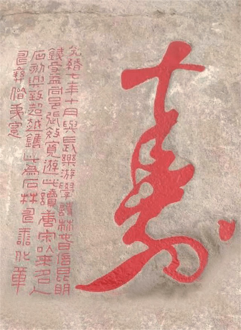 在“喝水岩”三个大字的榜书旁,留存清代章寿彝的行书“福”字。旁款将这一“福”字的来历进行了说明:光绪七年(1881),章寿彝与几位朋友游览鼓山,寺僧明本索要“福”字,章寿彝欣然命笔。巧的是,在2021年风景美化中,发现乌山上还深埋着一个“寿”字,竟然是章寿彝同一时期所作。
