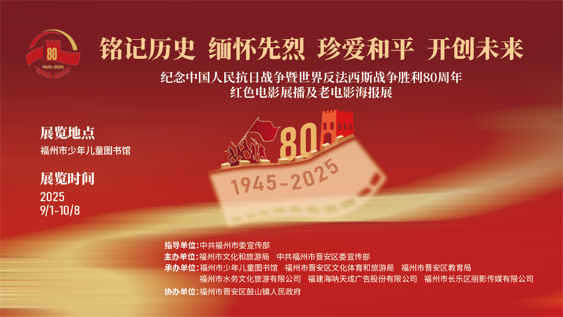 为深入贯彻落实中央、省委、市委宣传部相关工作部署,推进中国人民抗日战争暨世界反法西斯战争胜利80周年群众性主题宣传活动,进一步弘扬爱国主义精神,增强群众民族自豪感与历史责任感,丰富群众文化休闲生活,9月1日起,由中共福州市委宣传部指导,福州市文化和旅游局、晋安区委宣传部联合主办的“铭记历史 缅怀先烈 珍爱和平 开创未来——纪念中国人民抗日战争暨世界反法西斯战争胜利80周年红色电影展播及老电影海报展”将正式启动。