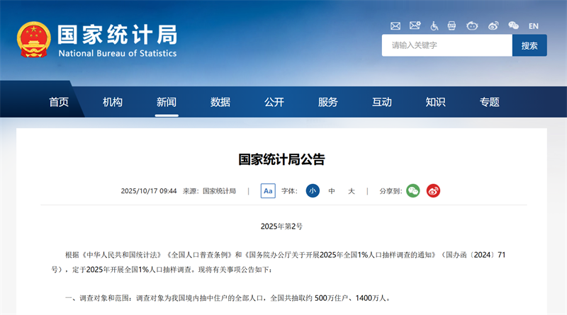 2025年全国1%人口抽样调查的标准时点为2025年11月1日零时,调查员将在11月1日至11月15日入户开展调查,在全国共抽取约500万户、1400万人进行调查。