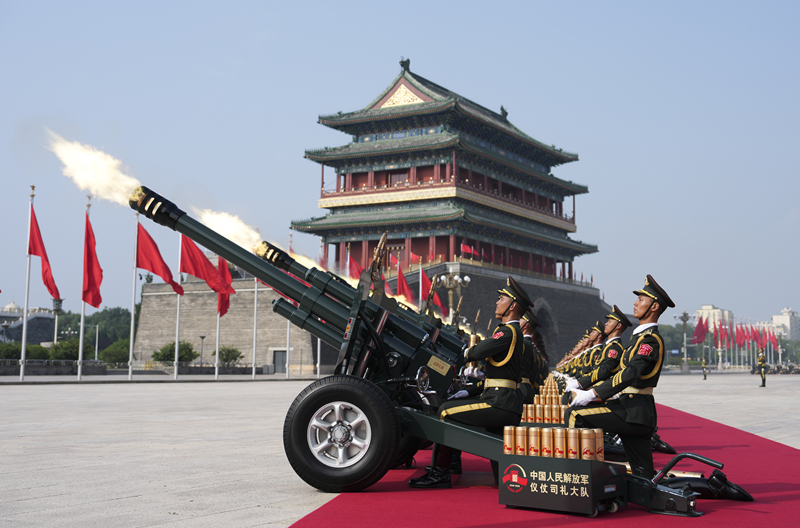 2025年9月3日,纪念中国人民抗日战争暨世界反法西斯战争胜利80周年大会在北京隆重举行。这是礼炮在天安门广场鸣响。新华社记者 牟宇 摄