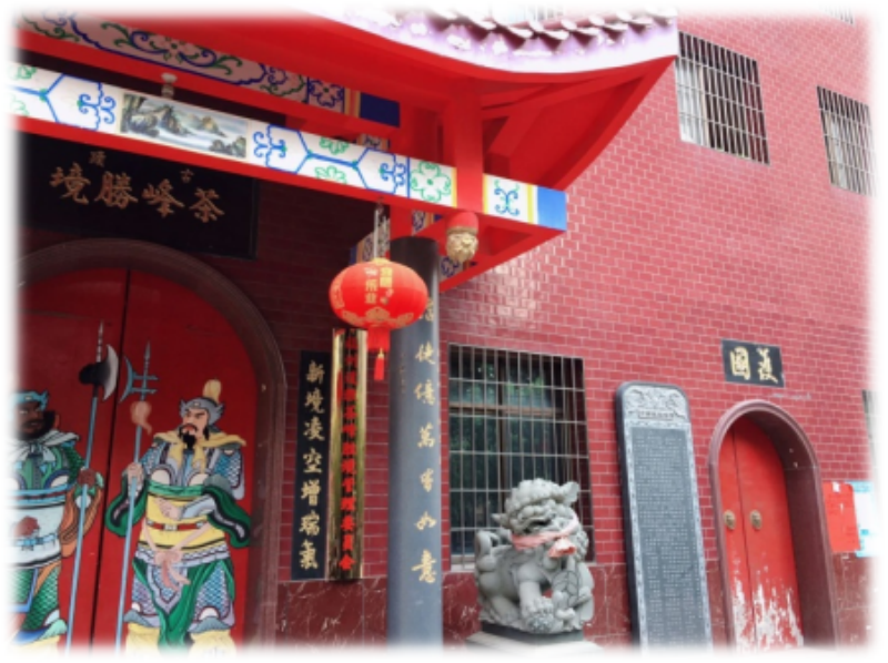 新建的茶峰胜境,共三层,屋宇上飞檐流金,屋脊装饰,双龙戏珠,旭日东升,整体宏伟壮观,景观雅致。大门口半飞式檐亭,主柱上刻有一楹联:“信徒亿万皆如意;灵庙三千自壮观。”二位门神护尉秦叔宝和胡敬德守卫境门,有门联:“新境凌空增瑞气;威神显应佑茶峰。”一层厅堂有签名联:“茶洗尘心,日月指间犹染彩;峰迎海客,乾坤壶里且流香。”