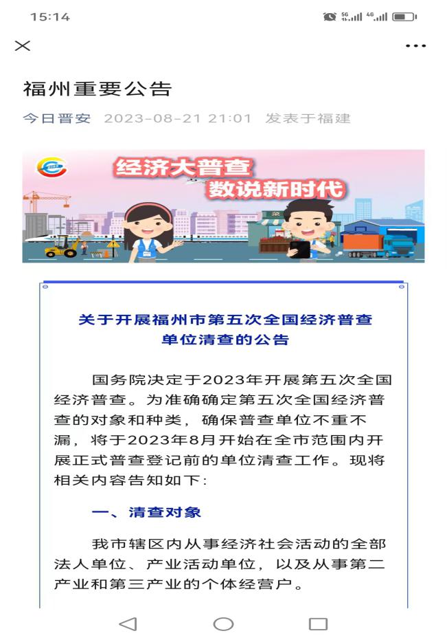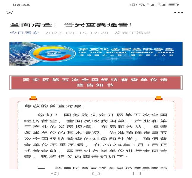 为更好提升人民群众对经济普查工作的认知度,增强普查对象对普查工作的配合度。晋安区广泛动员干部职工及其亲属通过微信群、朋友圈等线上新媒体方式推送第五次全国经济普查单位清查告知书,截至目前为止,推送转发第五次全国经济普查单位清查告知书约3000条次,搭建经普宣传指尖“阵地”,让经普宣传与全区社会公众“零距离”对接,力争宣传全覆盖。