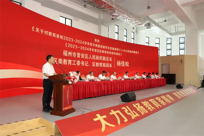区政府副区长、区委教育工委书记、区教育局局长杨佳松同志宣读表扬通报。对区教育系统2023-2024学年教学质量贡献奖先进集体和个人及各级各类荣誉获奖情况予以表扬。
