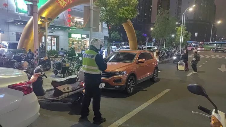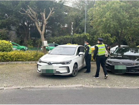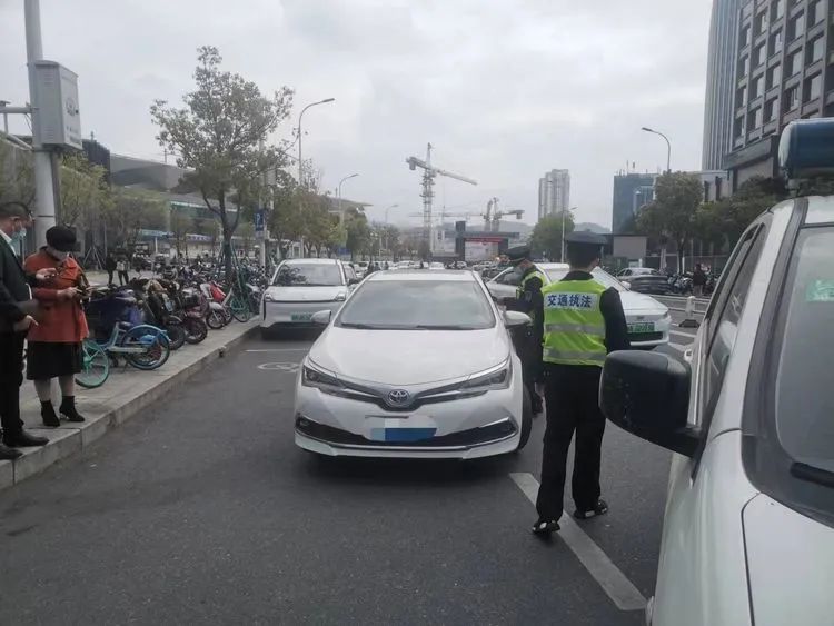 ▲金鸡山交警中队对北广场贵宾通道违停和压线车辆现场处罚