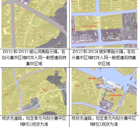 在晋安区行政区域内,存在两个紧密分布的小区被交通干线分隔成小面积(<0.1km2)区域,将该类交通干线划入集中区域内,此类情况主要出现在DY27、DY28、DY035、DY037。