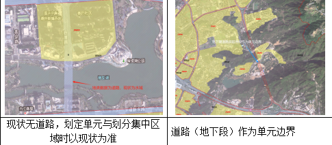 因划定区域内东北侧靠近山体区域面积过大,部分交通干线存在地下部分无法合理切割单元,以交通干线地面延伸段作为单元切割边界。
