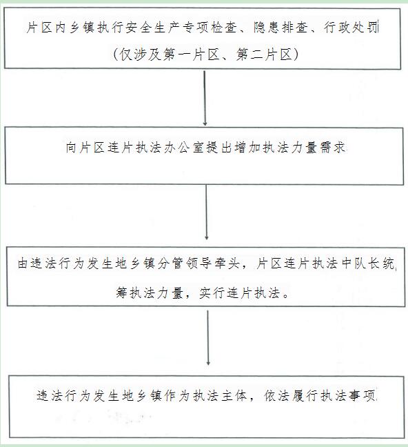 1、 由区应急管理局综合行政执法大队向各片区派驻不少于1名 在编执法人员,按照“连片整合、联合执法”的原则,负责协调指导片区、乡镇(街道)开展安全生产执法工作。